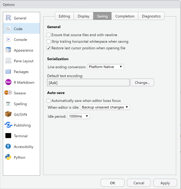 Code > Saving에서 Default text encoding : [Ask]를 [UTF-8]로 변경해 줍니다.