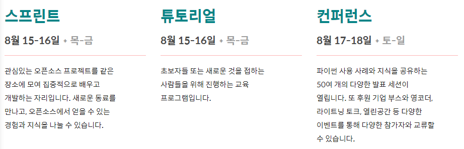 크게 스프린트와 튜토리얼 그리고 컨퍼런스로 나뉩니다.
