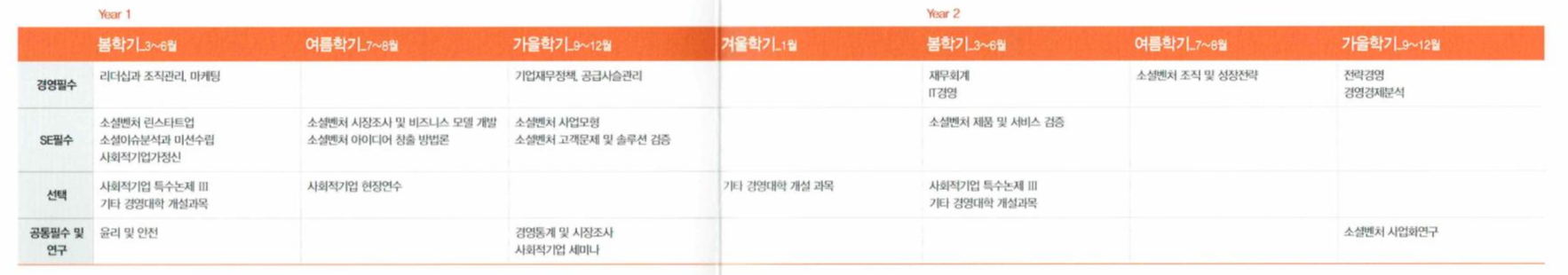 - SE필수 : 소셜벤처 린스타트업, 소셜이슈분석과 미션수립, 사회적기업가정신, 소셜벤처 시장조사 및 비즈니스 모델 개발, 소셜벤처 아이디어 창출 방법론, 소셜벤처 사업모형, 소셜벤처 고객문제 및 솔루션 검증, 소셜벤처 제품 및 서비스 검증