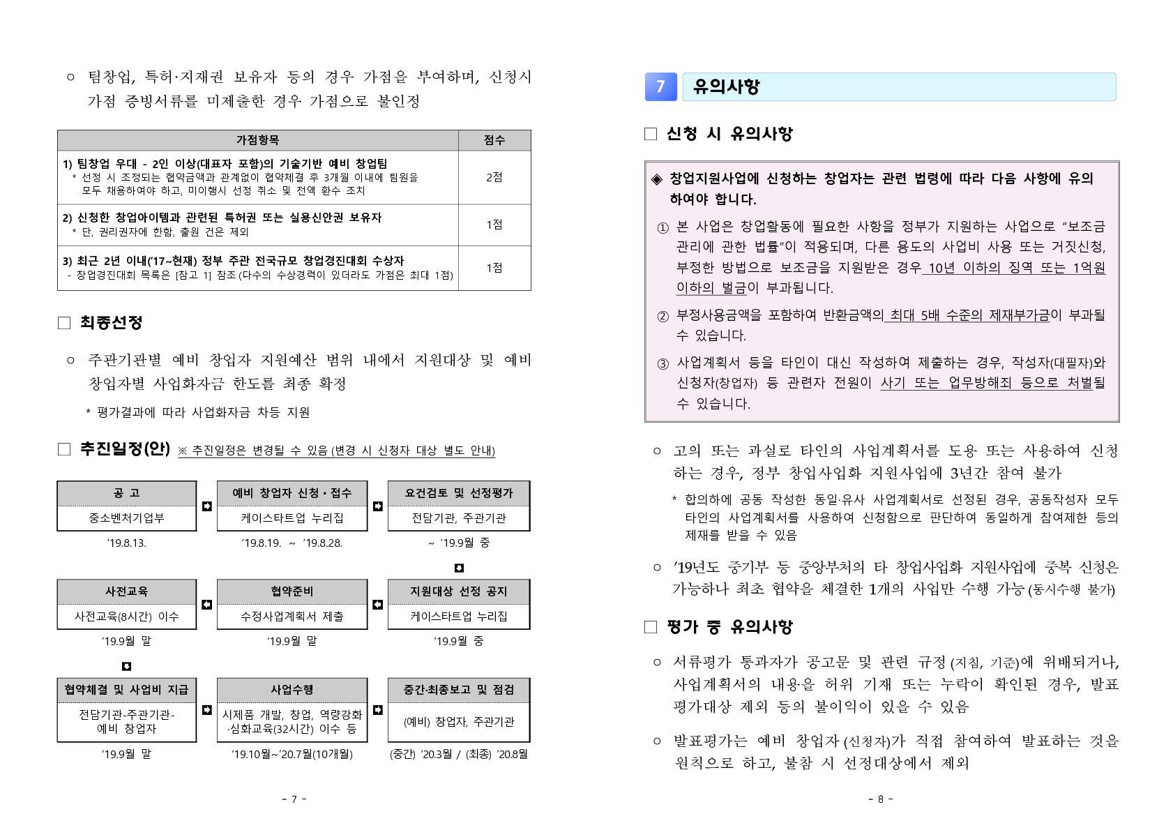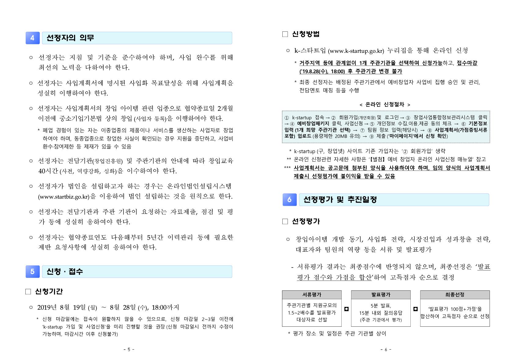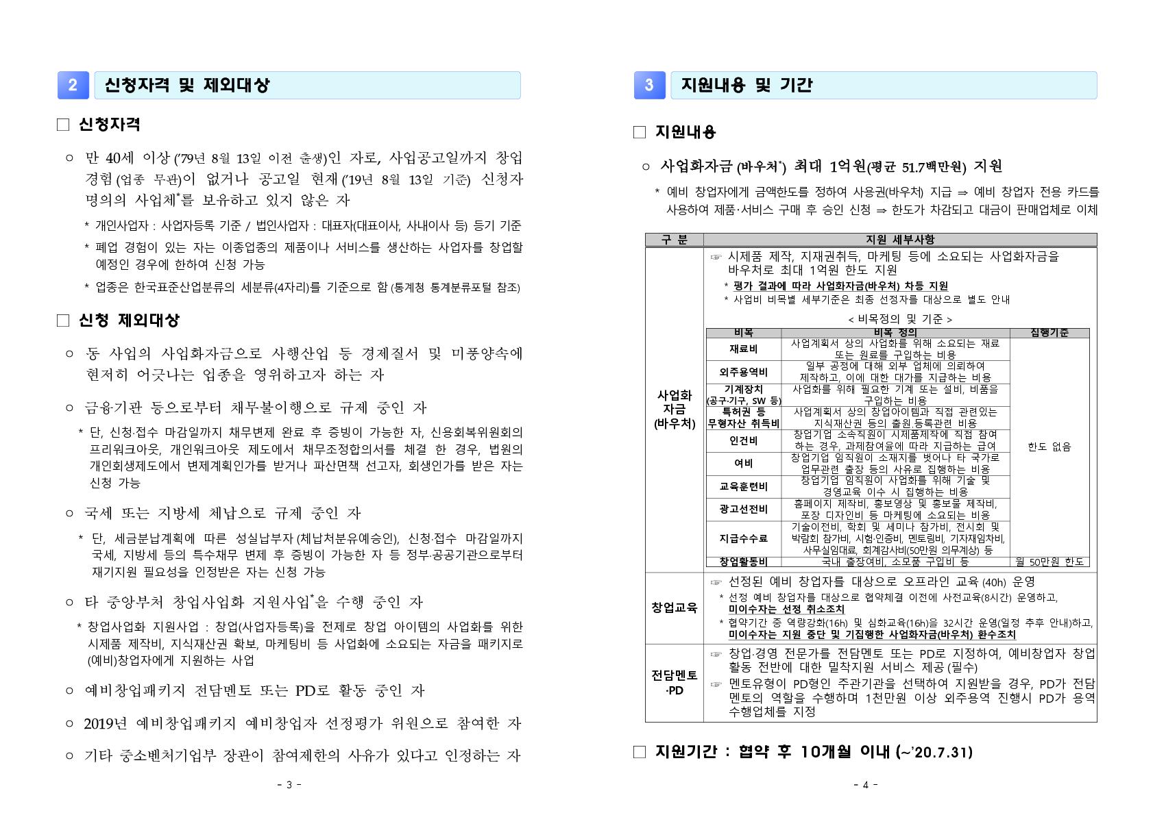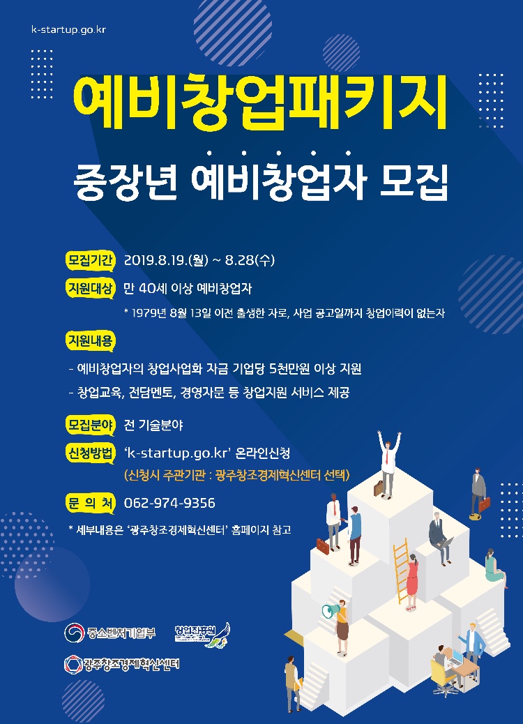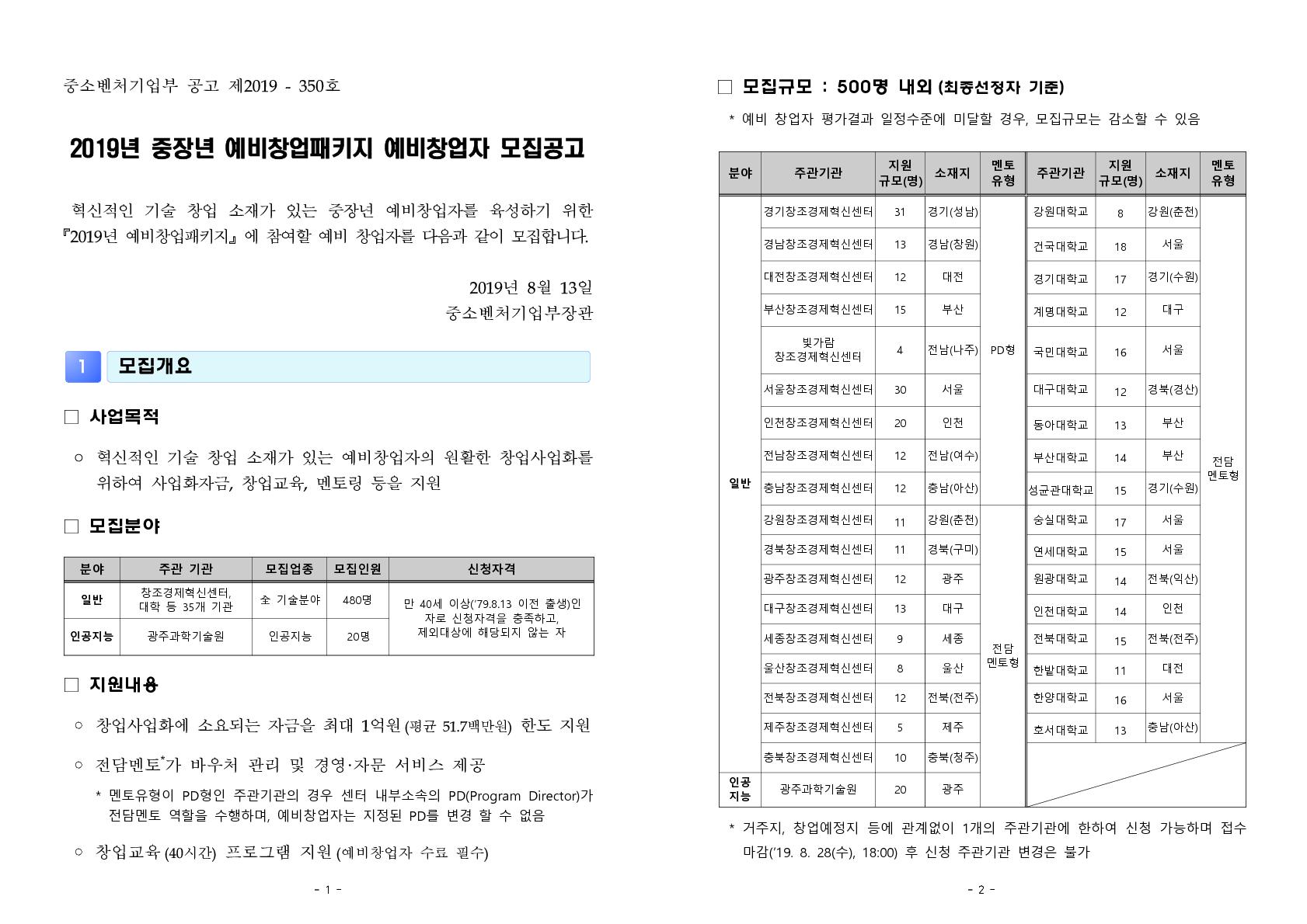 중소벤처기업부 공고 제2019 - 350호 2019년 중장년 예비창업패키지 예비창업자 모집 공고 혁신적인 기술 창업 소재가 있는 중장년 예비창업자를 육성하기 위한 『2019년 예비창업패키지』에 참여할 예비 창업자를 다음과 같이 모집합니다. 2019년 8월 13일 중소벤처기업부장관 신청방법 및 대상 신청기간 - 2019.08.19 (월) ~ 2019.08.28 (수) 18:00 까지 신청방법 - 온라인 접수 : (바로가기) ※ 회원가입 (대표자 명의)