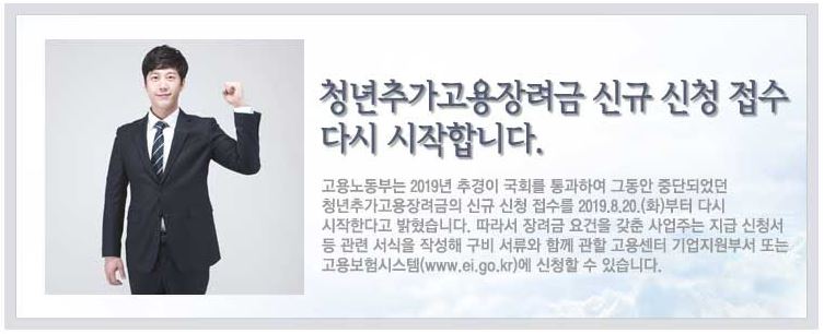 고용노동부는 2019년 추경이 국회를 통과하여 그동안 중단되었던 청년추가고용장려금의 신규 신청 접수를 2019.8.20(화)부터 다시 시작한다고 밝혔습니다. 따라서 장려금 요건을 갖춘 사업주는 지금 신청서 등 관련 서식을 작성해 구비 서류와 함께 관할 고용센터 기업지원부서 또는 고용보험시스템(www.ei.go.kr)에 신청할 수 있습니다.