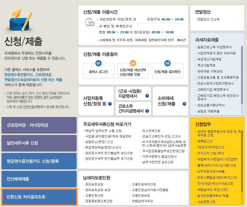 홈텍스에 들어가면 가장먼저 눈에 띄는 화면입니다. "신청/제출"을 클릭해 주세요.
