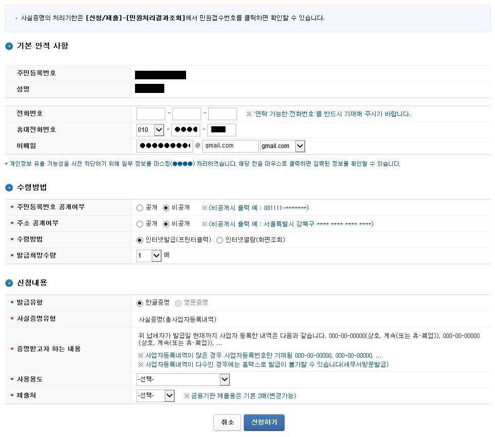 제출처와 사용용도에 맞게 <수령방법>과 <신청내용>의 세부사항들을 잘 선택해 주세요.