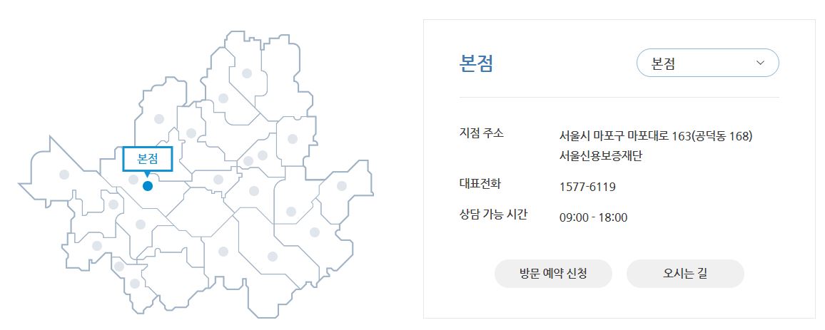 서울 신용보증재단의 경우 마포구에 본점을 비롯하여 서울에만 22개의 지점이 있습니다.
