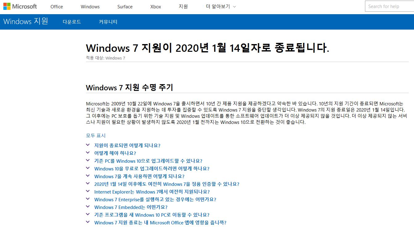 2020년 1월 14일 공식적으로 윈도우 7의 지원이 종료된다고 합니다.