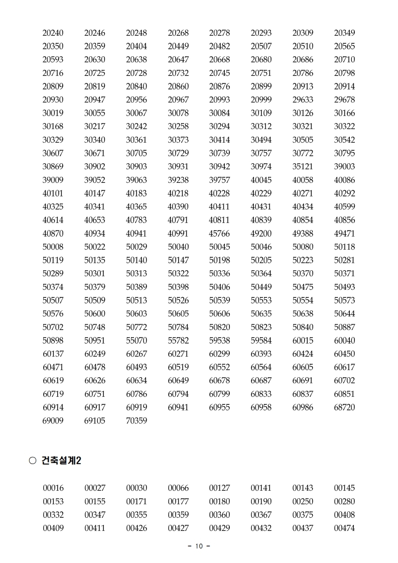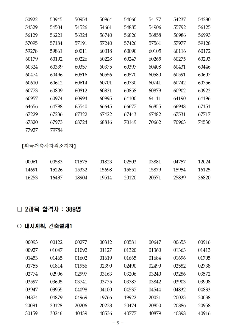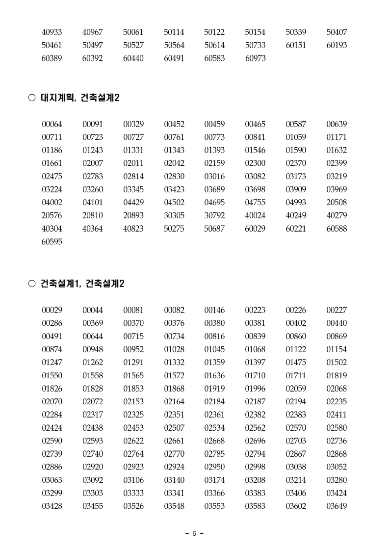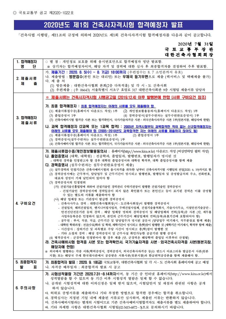 공고 제2020-1022호 ◎ 국토교통부 공고 제2020-1022호 2020년도 제1회 건축사자격시험 합격예정자 발표 「건축사법 시행령」제11조의 규정에 의하여 2020년도 제1회 건축사자격시험 합격예정자를 다음