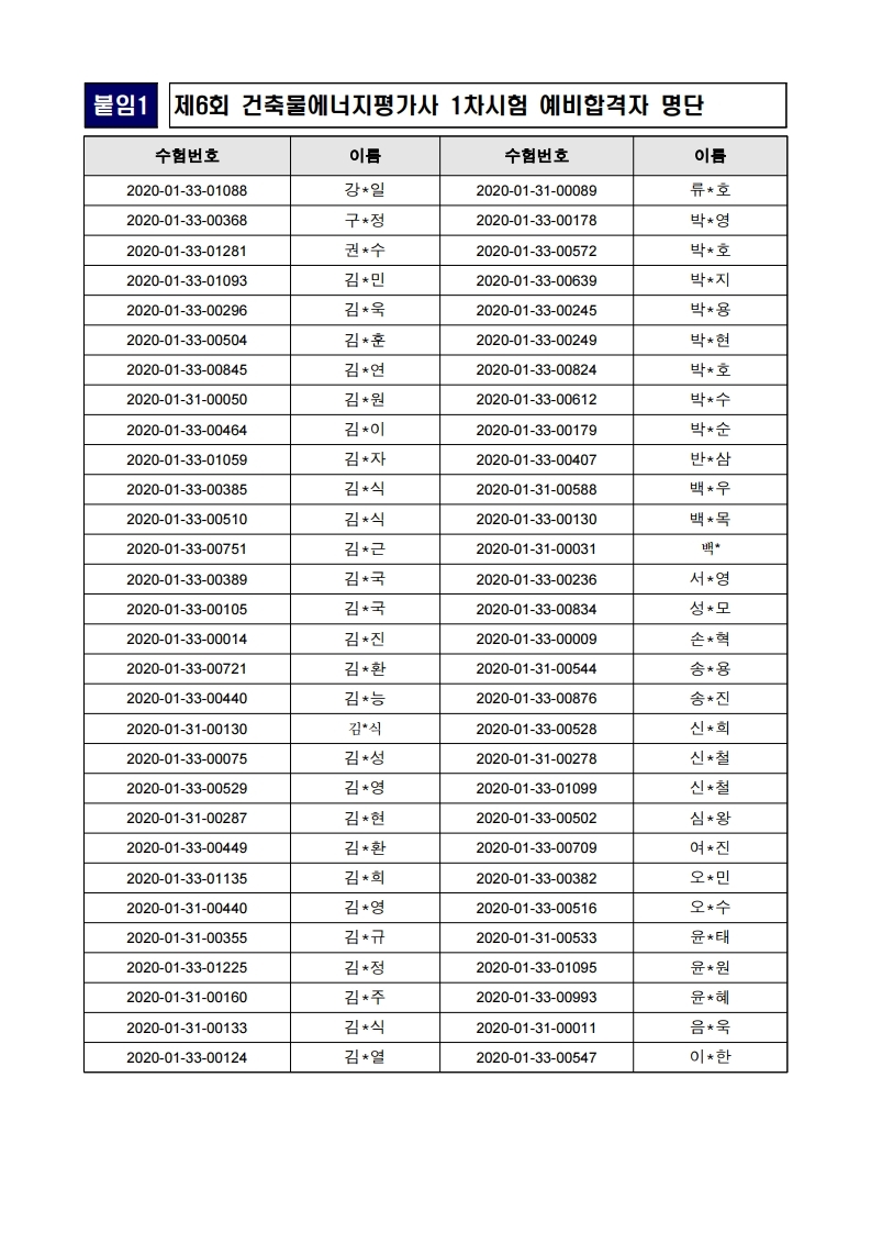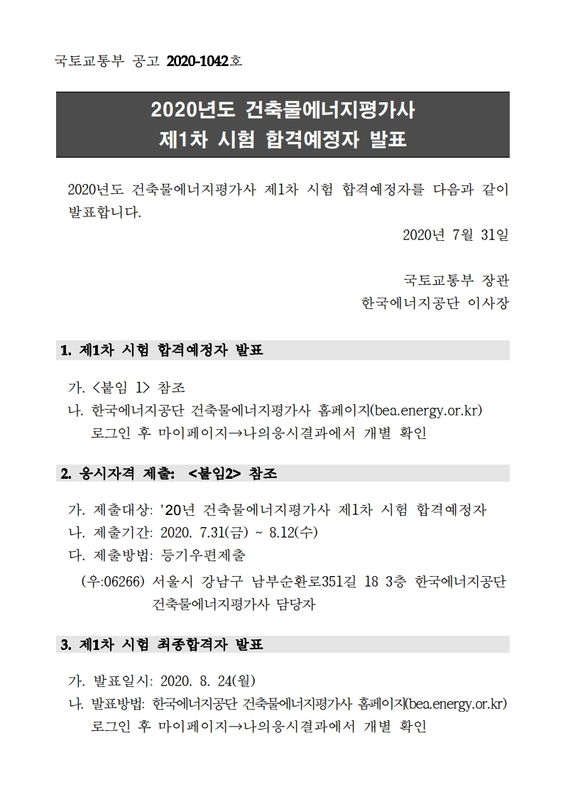 공고 제2020-1042호 국토교통부 공고 2020-1042호 2020년도 건축물에너지평가사 제1차 시험 합격예정자 발표 2020년도 건축물에너지평가사 제1차 시험 합격예정자를 다음과 같이 발표합니다. 2020년 7월