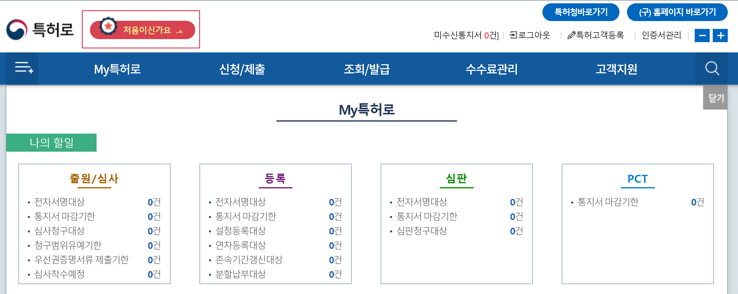 처음 로그인하시면, My 특허로로 들어가게 됩니다. 여기서 처음이신가요?를 클릭합니다.