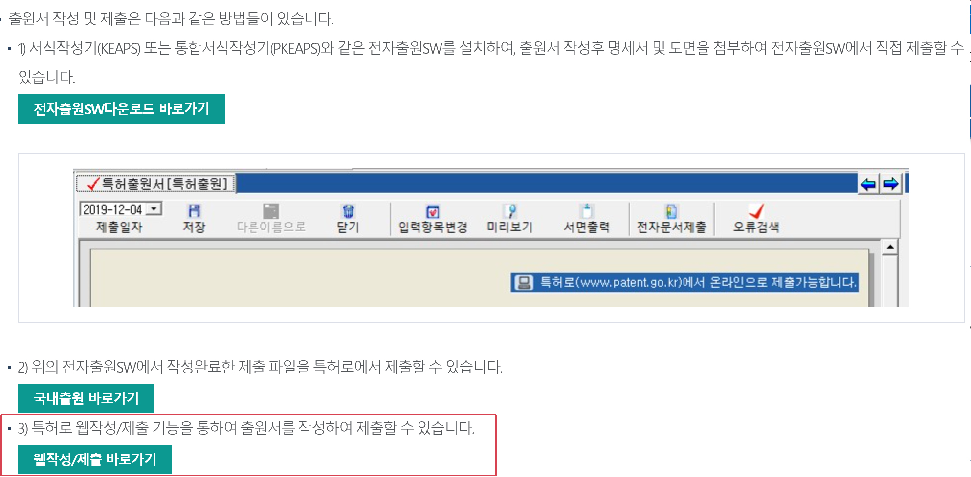 쭈욱 내리시다보면, 3) 특허로 웹작성/제출 기능을 통하여 출원서를 작성하여 제출할 수 있습니다. 가 나옵니다.