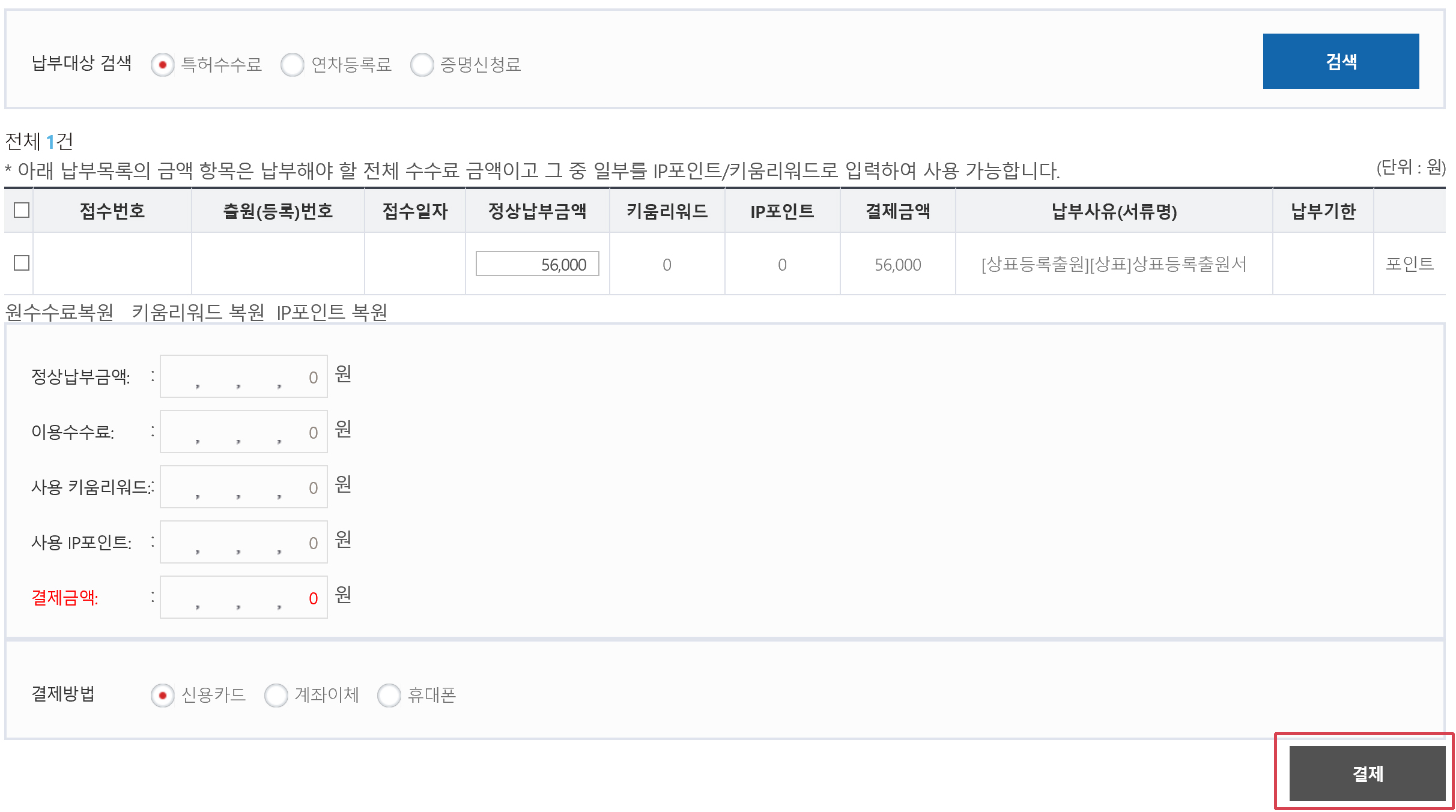상표 등록 출원 제출이 완료되었으면, 수수료를 납부하셔야 합니다.