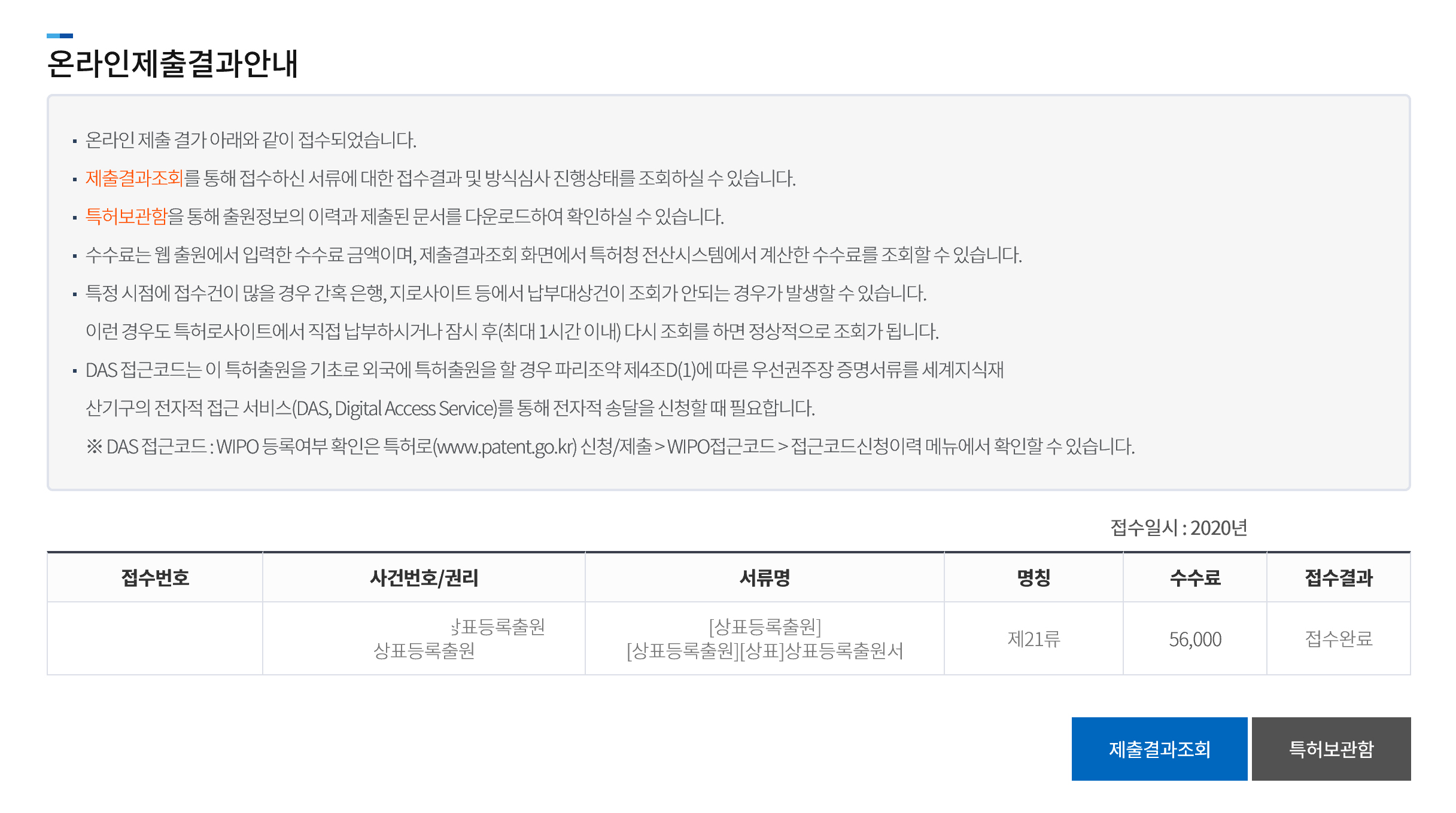 온라인 제출 결과 안내와 함께 접수가 완료된 것을 확인하실 수 있습니다.