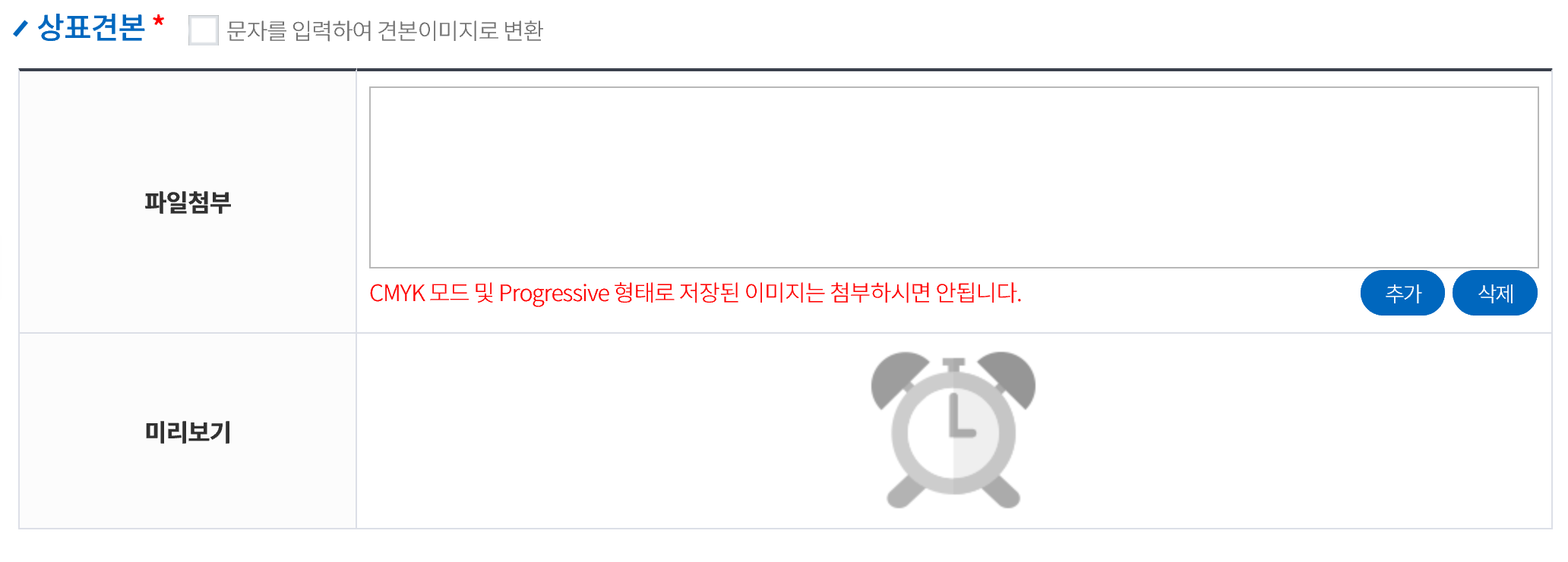 상표가 이미지인 경우, jpg 파일로 추가하여 업로드 합니다. 이때 CMYK는 안된다고 하니 주의하시기 바랍니다.