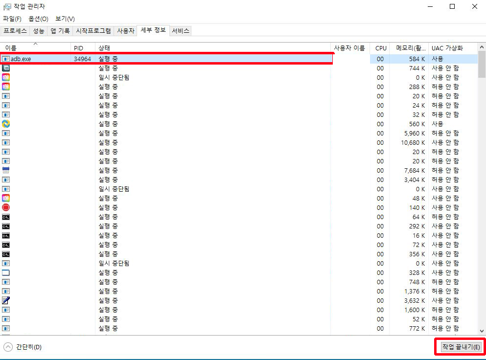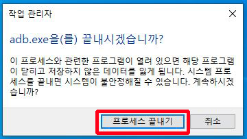 보시는 것처럼 adb.exe가 실행중임을 알 수 있습니다.