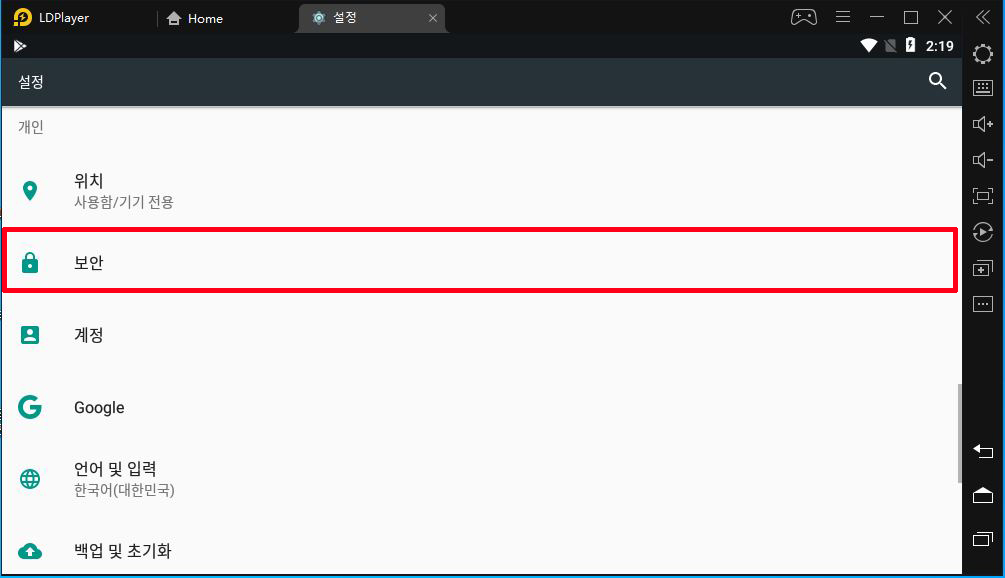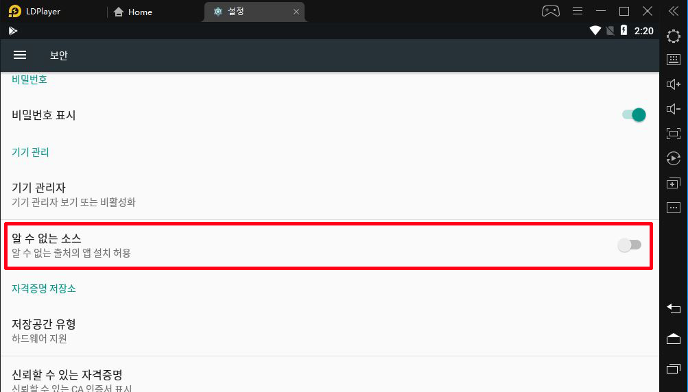 설정 > 개인 > 보안 > 알수없는소스에 활성화 되어 있습니다.