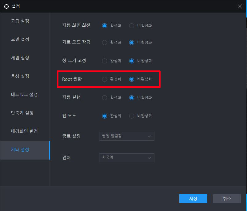설정 > 기타 설정 > Root 권한이 활성화 되어있는데, 비활성으로 바꿉니다.