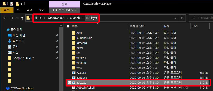 그리고 나면, C드라이브 > XuanZhi > LDPlayer에 가서 adb.exe를 삭제해 줍니다.