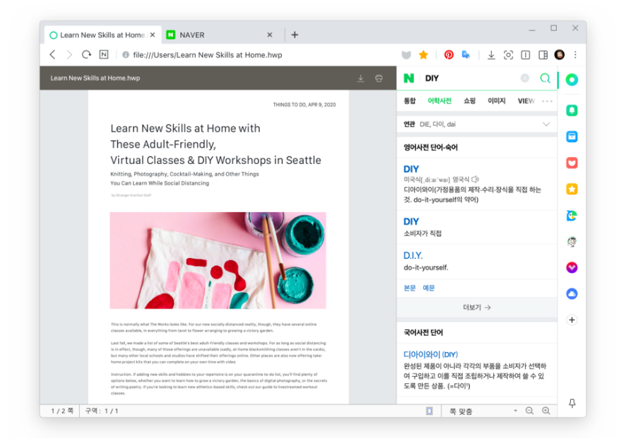 또한 뷰어를 통해 한글파일을 열어보고 있는 중에도, 웨일의 편의 기능들을 그대로 사용할 수 있기 때문에, 파파고 번역이나, 단어 검색등을 빠르게 가능합니다.
