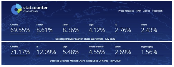 국내에서 Whale이 점유율이 많이 올라간 것을 알 수 있었습니다. safari보다 높네요.