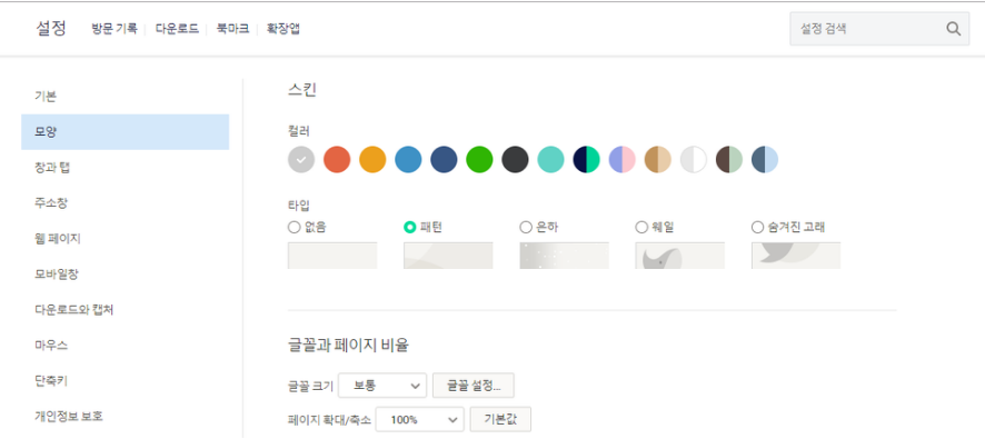 웨일 브라우저에는 14가지 스킨 컬러와 5개의 패턴이 있습니다.