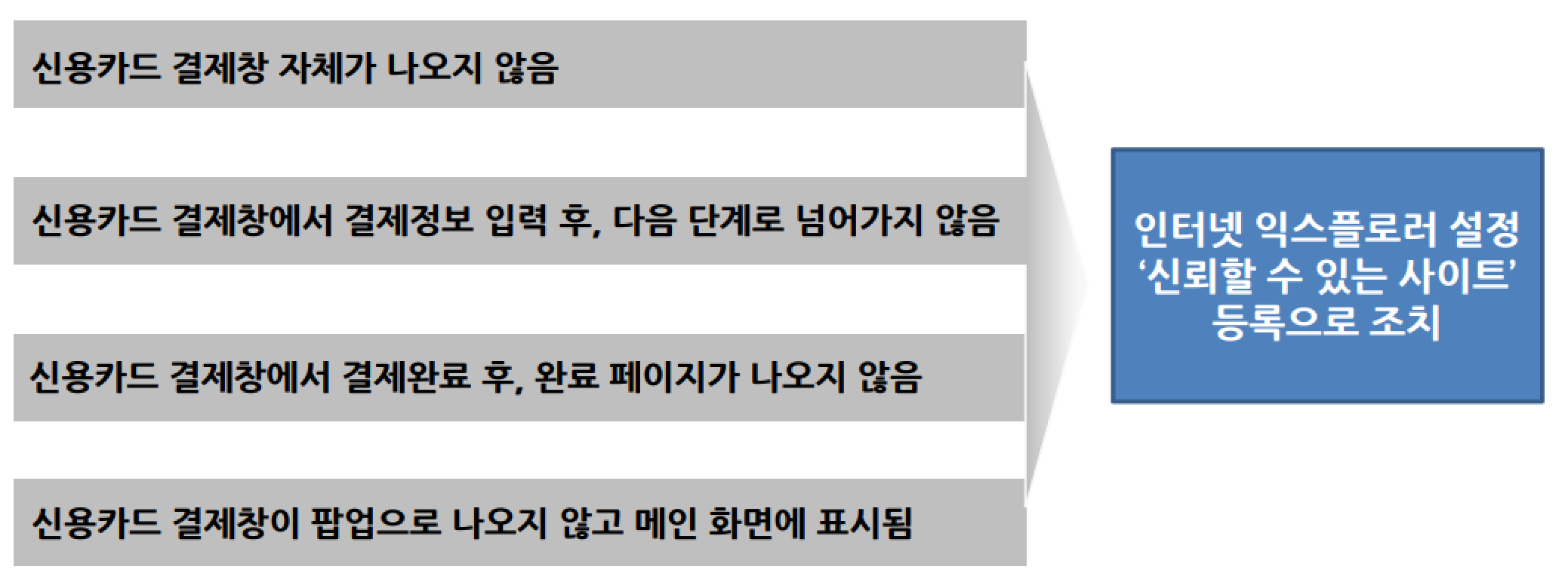 카드사별 신뢰할 수 있는 사이트 주소 등록을 통해서 해결 가능합니다.
