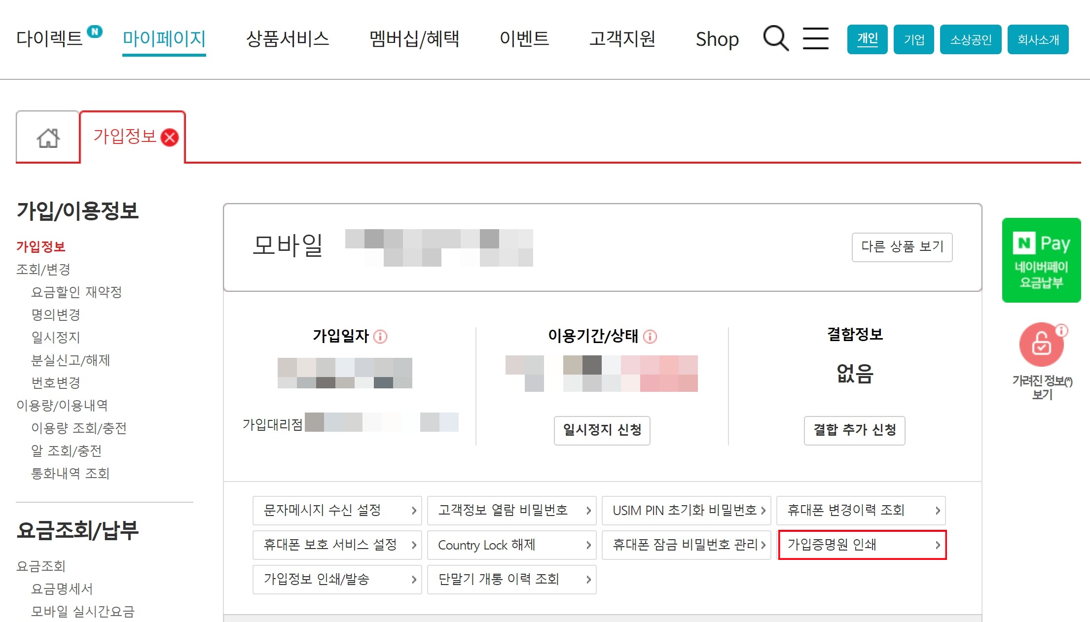 로그인 > 마이페이지 > 가입정보 > 가입증명원 인쇄