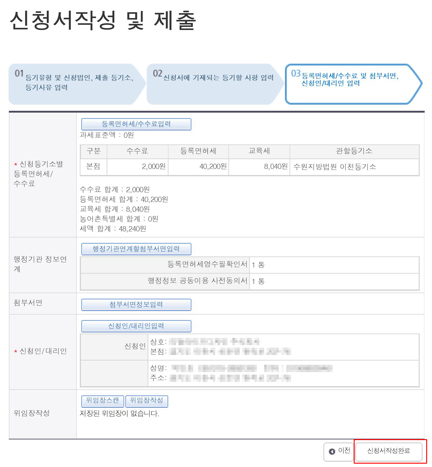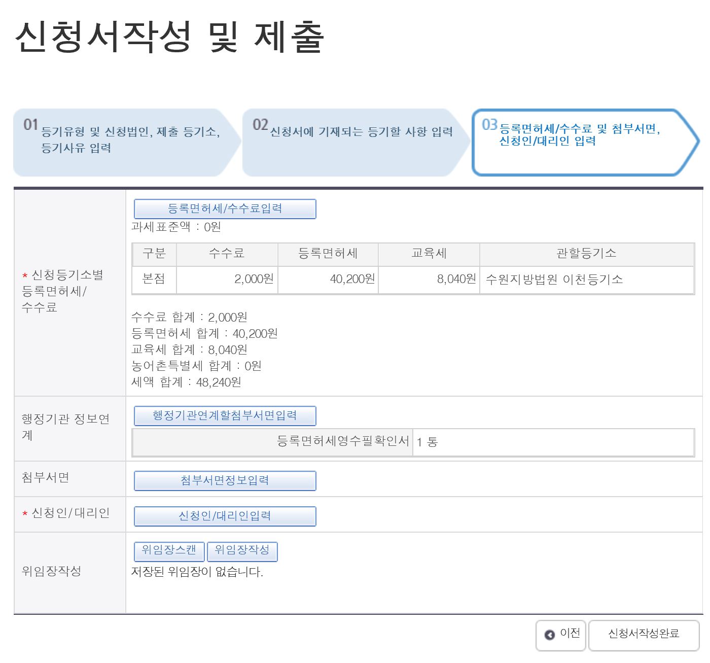 03 등록면허세/수수료 및 첨부서면, 신청인/대리인 입력으로 넘어갑니다.