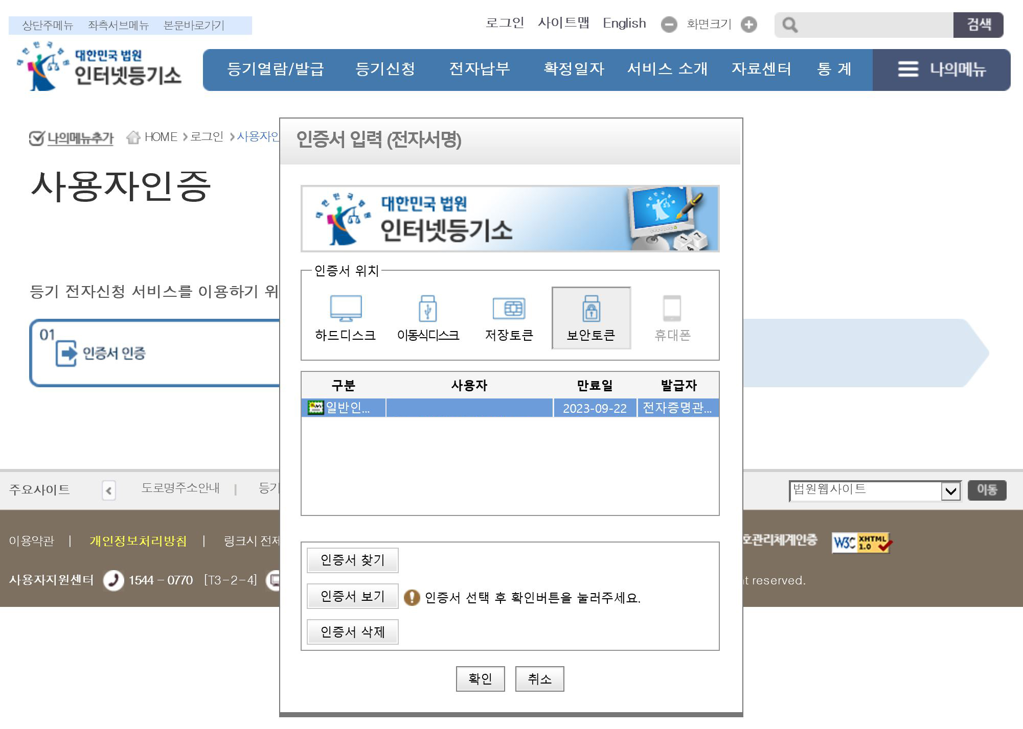 전자신청사용자로 로그인 > 전자신청로그인 > 보안토큰 > 인증서 선택 하고 비밀번호를 입력합니다.