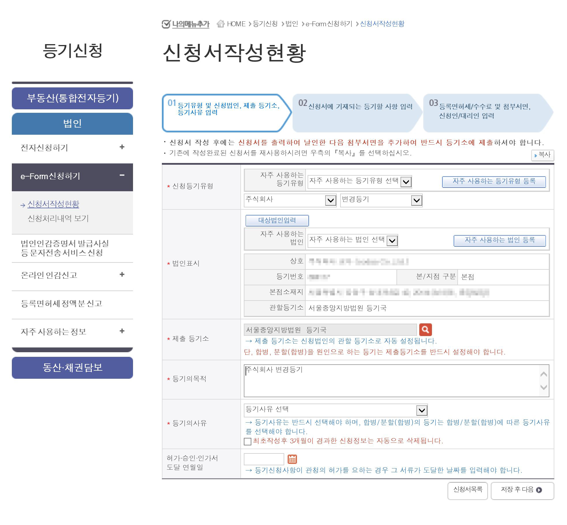 01 등기유형 및 신청법인, 제출 등기소, 등기사유 입력 에서