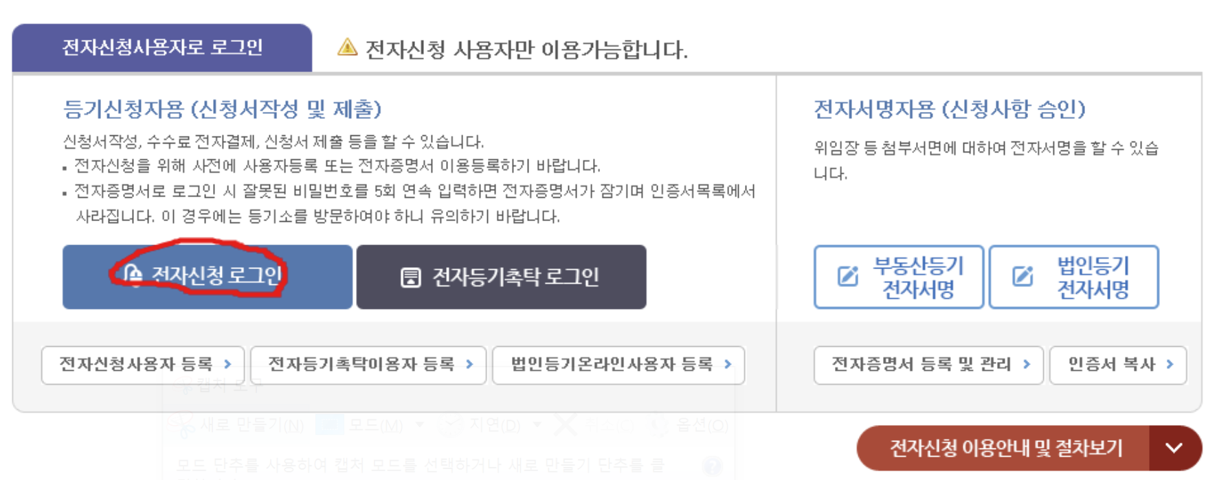 -> 법인전자증명서는 관할 등기소에 직접 방문해서 신청해야 함.