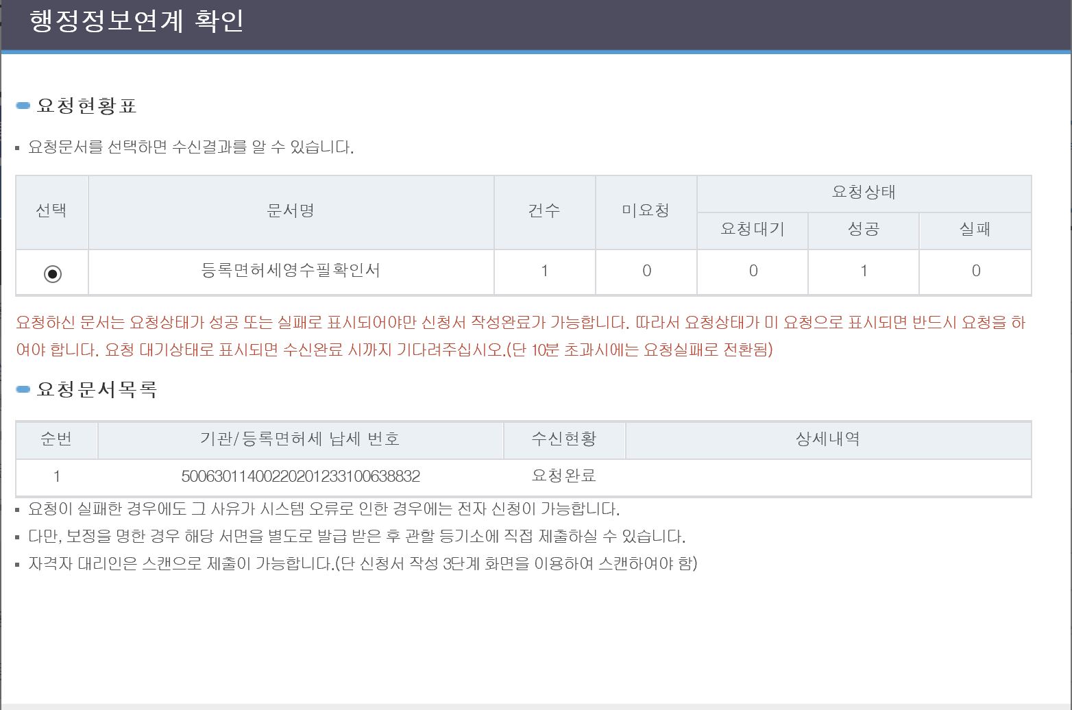 등록면허세영수필확인서도 요청 후 성공되었는지 확인하여야 합니다.