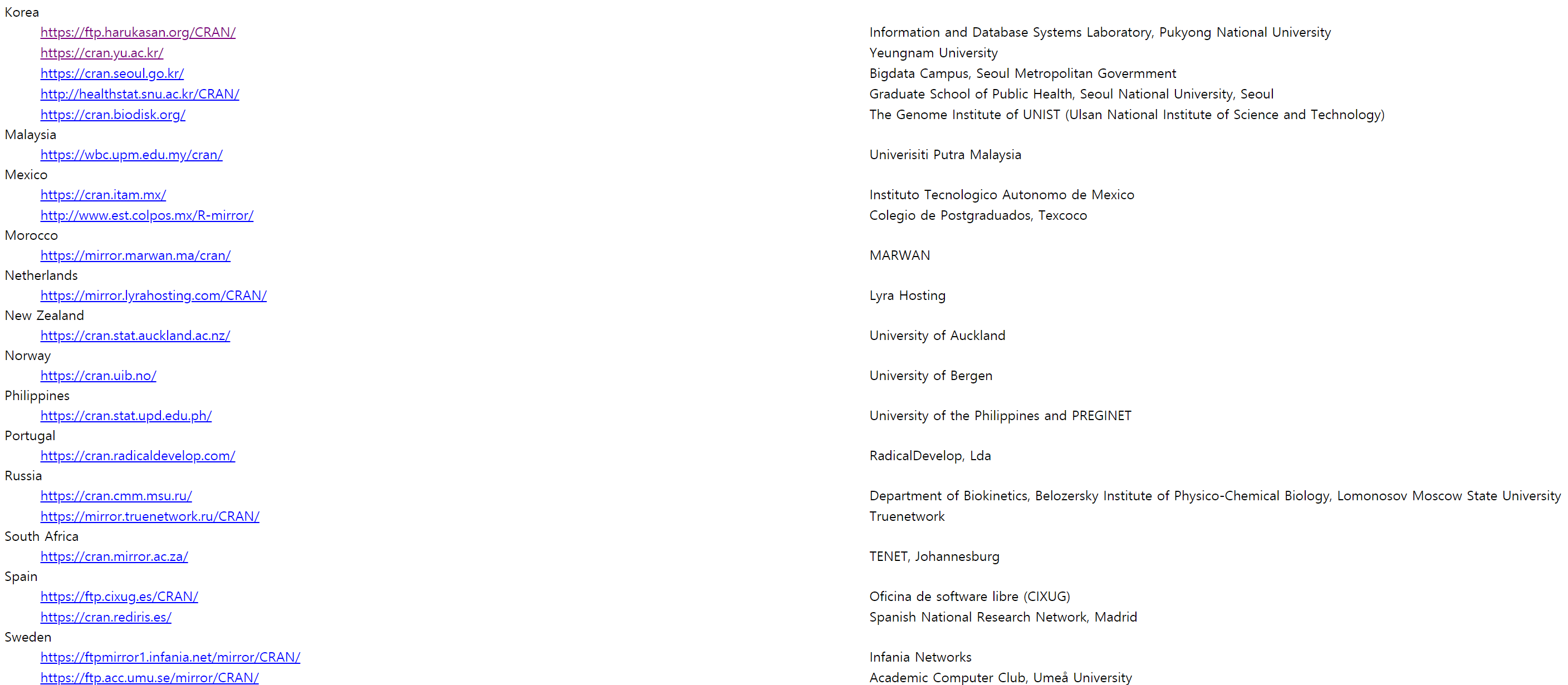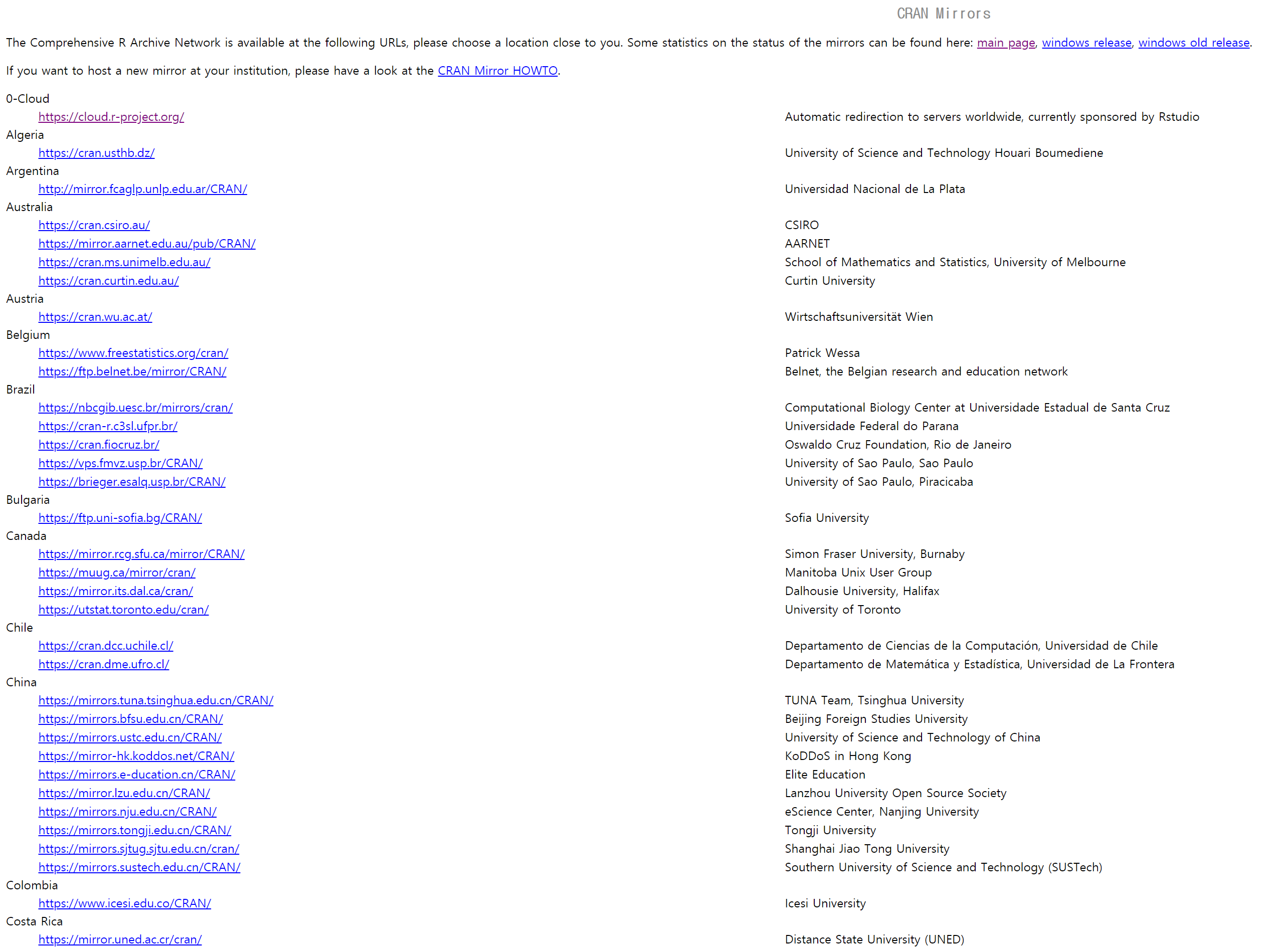 R은 무료 프로그램이라, 해당 프로그램의 설치 파일을 세계 곳곳에 있는 자원단체의 서버에서 다운로드 할 수 있도록 하고 있습니다.