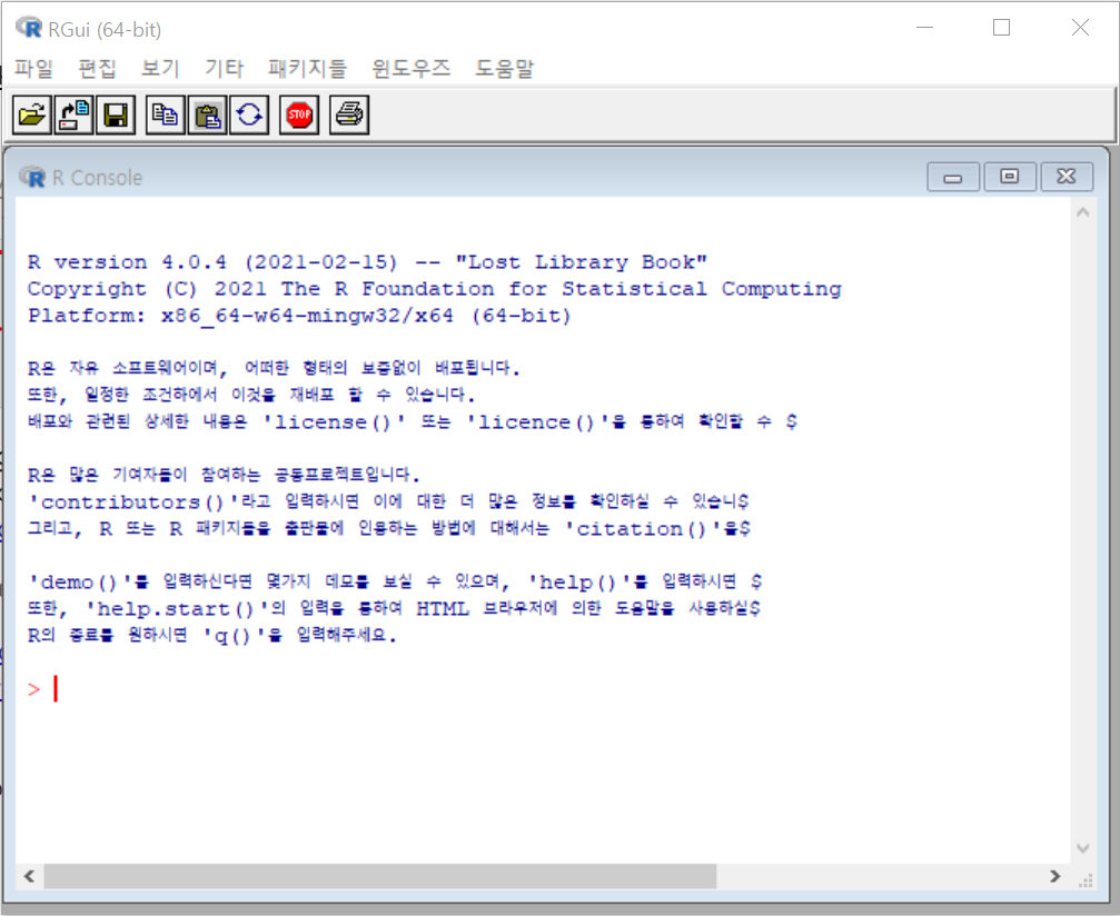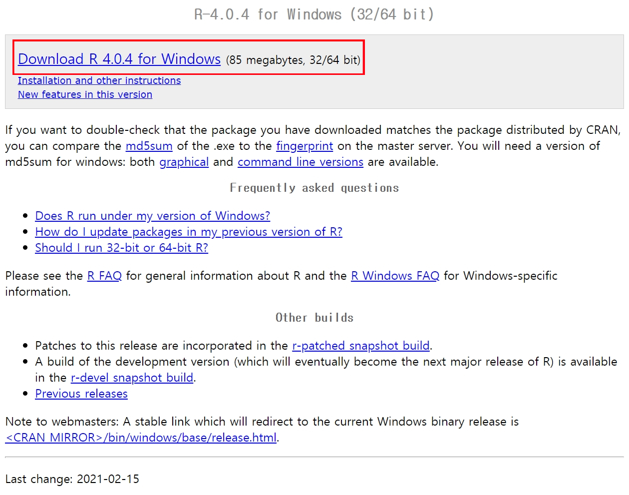 > 현재 R은 4.0.4 버전이고, 약 85메가의 간단한 프로그램입니다.