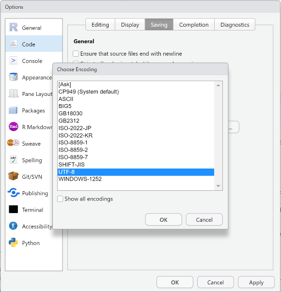 Code > Saving에서 Default text encoding : [Ask]를 [UTF-8]로 변경해 줍니다.