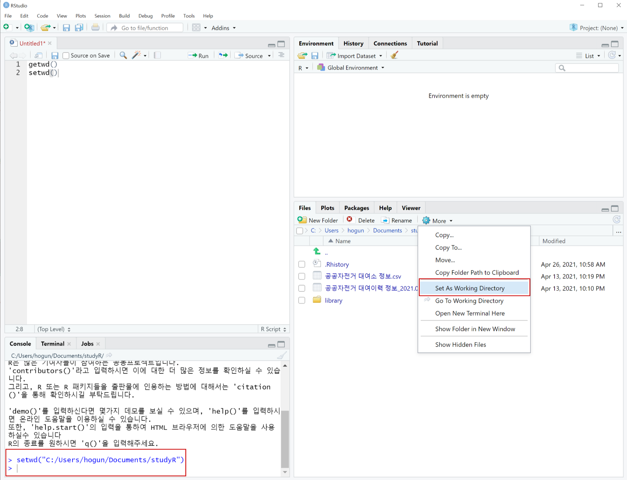 자동으로 Console에 setwd가 실행되는 것을 확인 하실 수 있습니다.