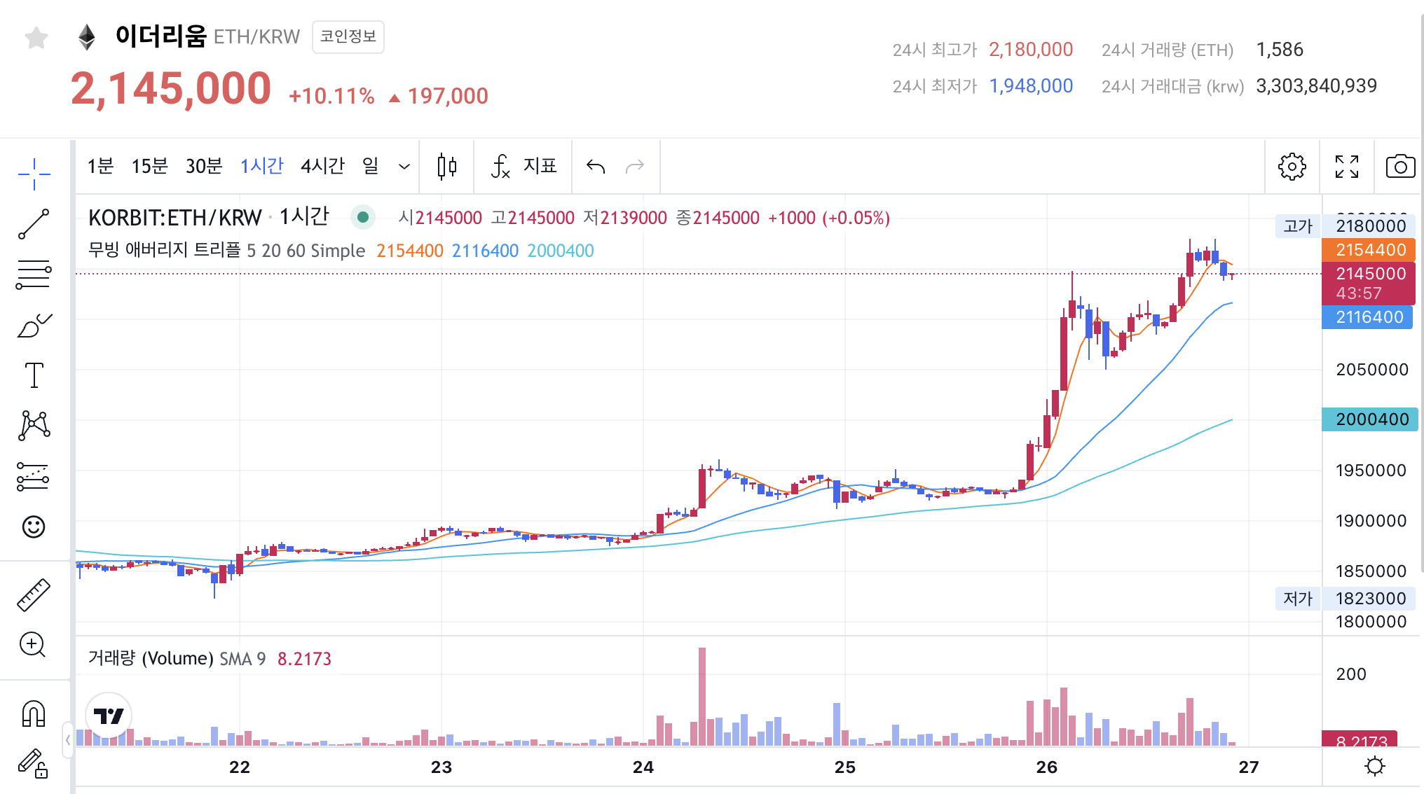 특이 이번 상승랠리의 시작점에서 주목되는 것은 이더리움입니다. 최근 다른 암호화폐에 비해서 이렇다할 존재감을 보여주지 못했는데, 오늘 1ETH 가 214만원을 기록하면서, 전일 대비 10% 가량 상승했습니다.