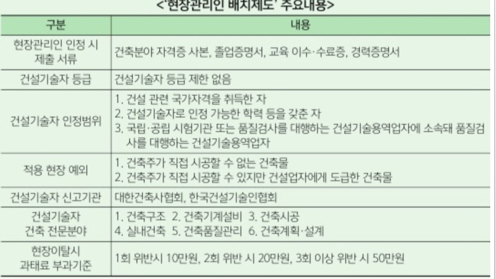 - 건설산업기본법 제 41조 제1항 각호에 해당하지 아니하는 건축물의 건축주는 공사 현장의 공정 및 안전을 관리하기 위하여 같은 법 제2조 제15호에 따른 "건설기술인 1명"을 현장관리인으로 지정하여야 한다.